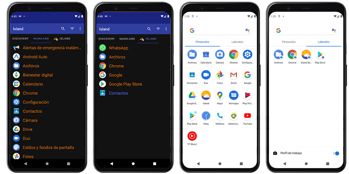 Una vez creado el sandbox verás que tu cajón de aplicaciones ahora estará separado en dos pestañas: personales (mainland) y trabajo (island). Cada pestaña cuenta con aplicaciones independientes y puedes identificar las del sandbox porque tienen un pequeño portafolio en el ícono de cada app (también puedes congelarlas cuando desees). Ojo, si tu capa de personalización no tiene cajón de aplicaciones (como MIUI) se creará una carpeta llamada “trabajo” en tu escritorio.