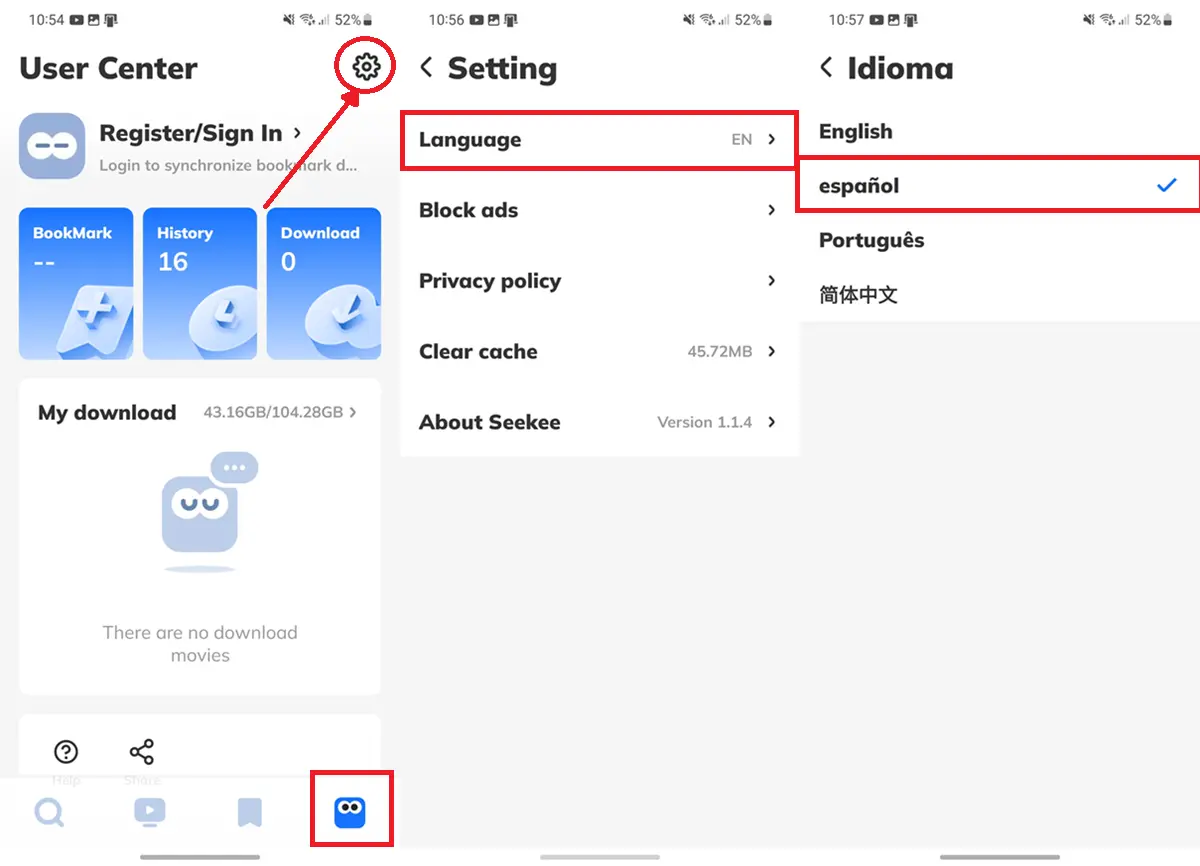 Por defecto, Seekee tiene la interfaz en inglés. Puedes cambiarla a español de esta forma: