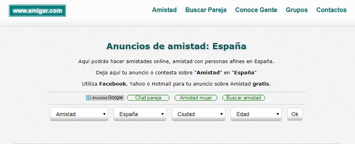 El punto fuerte de Amigar.com está en que coloca varias opciones para conocer personas, sin necesidad de hablar dentro de un chat interno. Para hablar con otras personas, basta con seleccionar el país, el tipo de relación que estamos buscando y la edad para que aparezcan solicitudes de perfiles de Facebook. Así de esta manera, puedes interactuar con otros usuarios desde otras aplicaciones de mensajería instantánea.