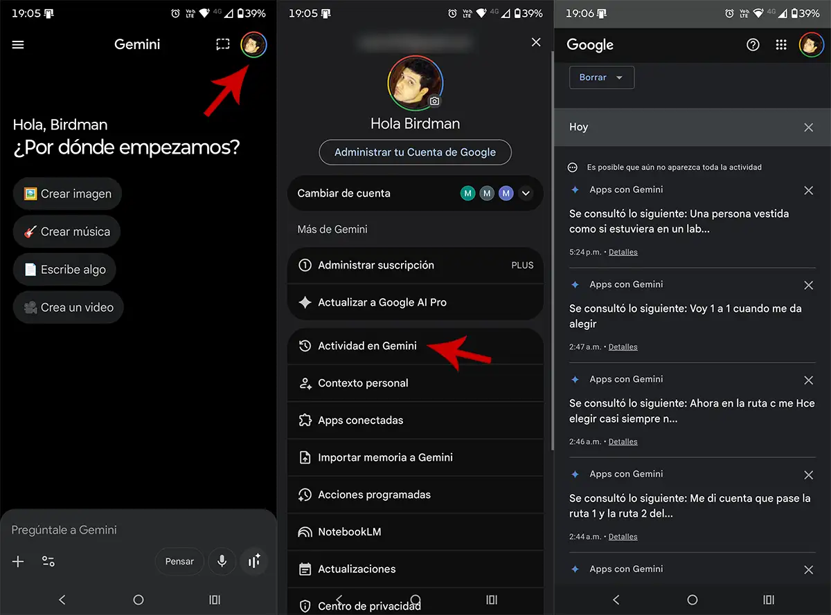 - Asegúrate de estar usando la misma cuenta de Google con la que hablaste en Gemini, porque el historial va ligado a cada perfil.