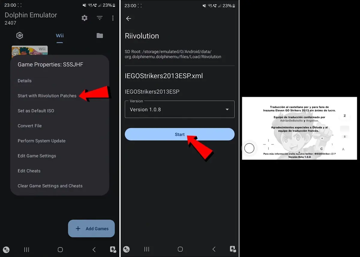 - Allí te aparecerá el parche de traducción que acabas de descargar. Presiona en Start para comenzar a jugar Inazuma Eleven GO Strikers 2013 en español y disfruta.