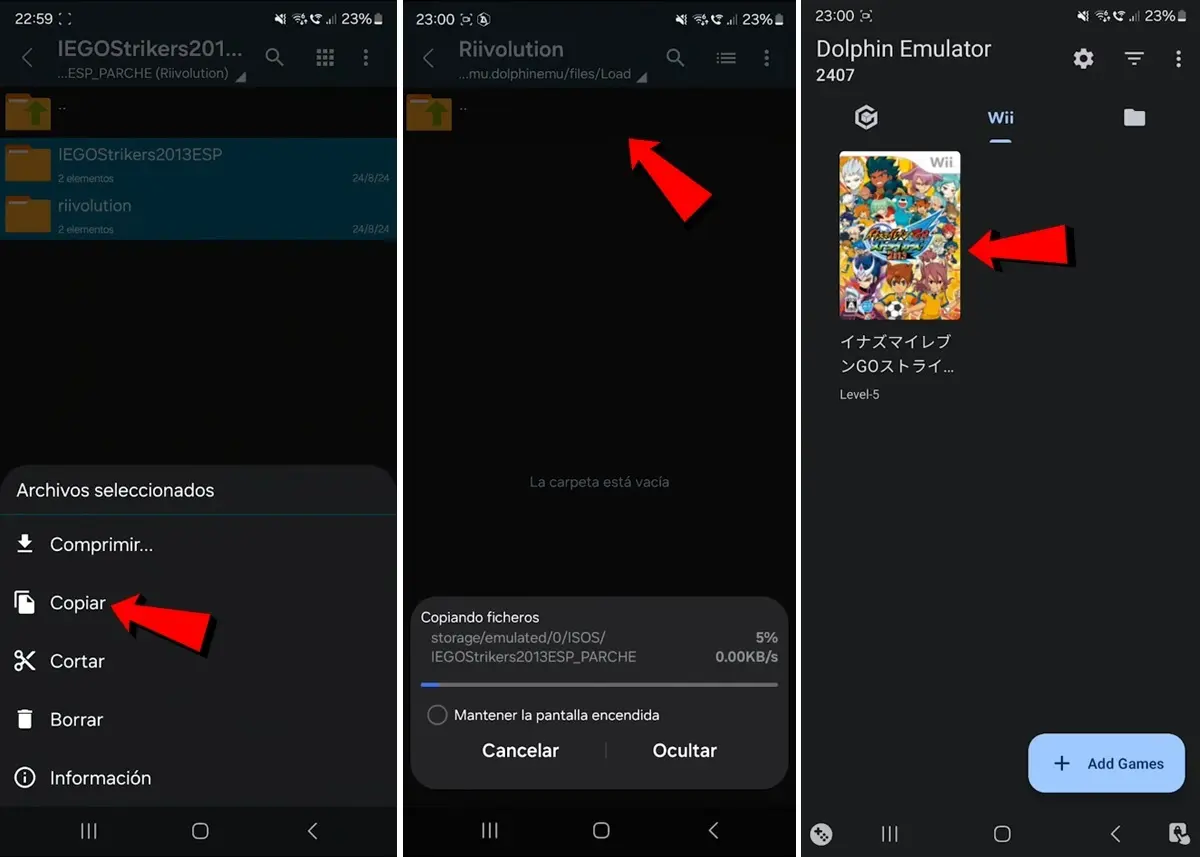 - Ahora copia las dos carpetas que acabas de extraer y pégalas en la dirección: Android > data > org.dolphinemu.dolphinemu > file > Load > Riivolution.