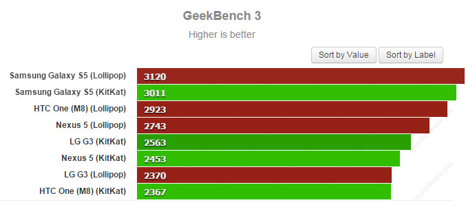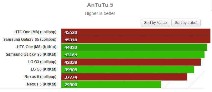 Ante la duda de con qué versión de Android logran mejor rendimiento los móviles Android, los chicos de GSMArena han sometido a varios terminales con Android Lollipop y Android KitKat a los test de rendimiento más famosos de Android, para saber que SO logra el mejor rendimeinto. Los terminales elegidos fueron el Nexus 5, el HTC One M8, el Galaxy S5 y el LG G3, los terminales de gama alta de la pasada generación que venían de serie con Android KitKat pero que a día de hoy disfrutan de Lollipop.