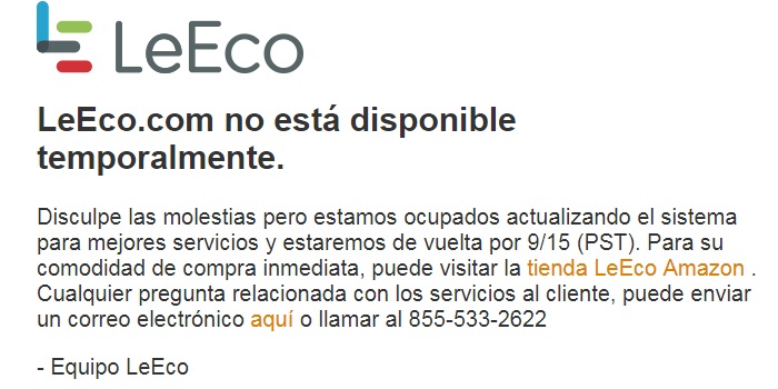 Hace un tiempo atrás, un reportero pudo capturar varias fotografías del complejo de oficinas de LeEco en Estados Unidos donde claramente se observaban espacios vacíos y unos pocos trabajadores. Estas imágenes causaban teorías diferentes sobre si los resultados de la empresa no eran buenos, o si se iban a mudar de localidad, entre otras cosas, pero lo que realmente está sucediendo, es que cuando decidimos ingresar a la web oficial estadounidense, nos aparece una información que proyecta que está en mantenimiento.