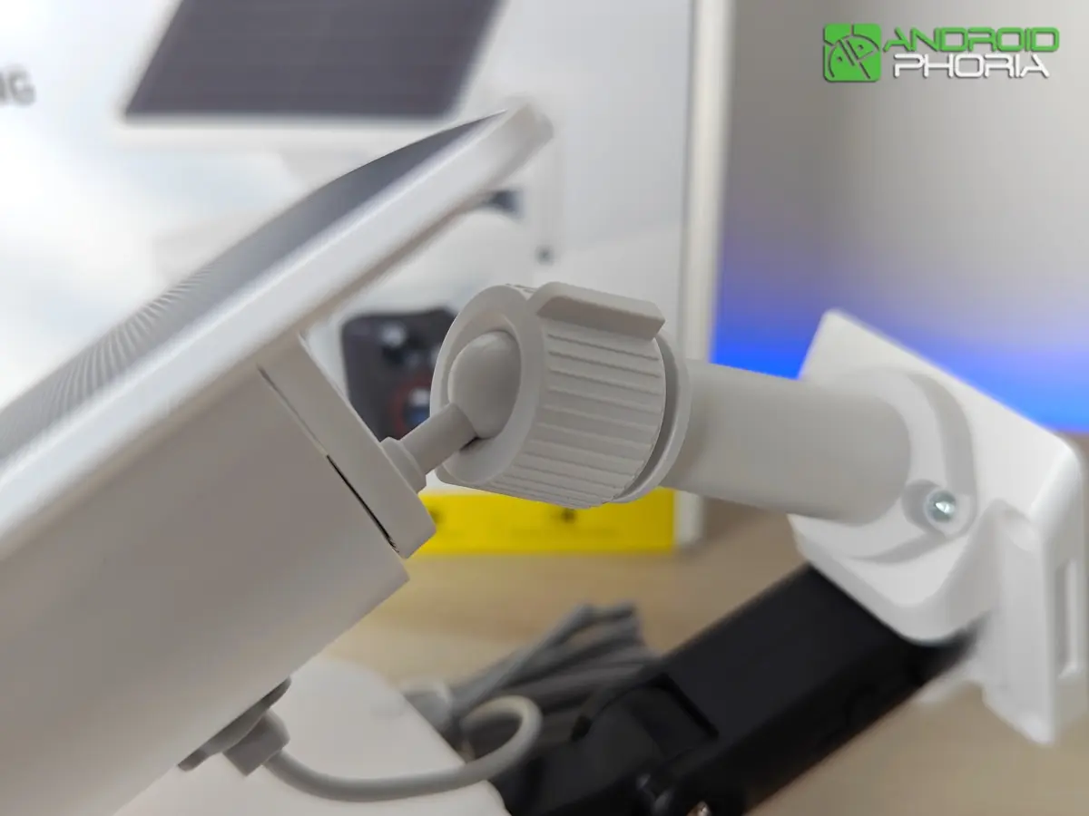 El soporte del panel solar también ofrece un eje ajustable y su instalación es igual de sencilla: el panel se enrosca al soporte y este se fija en la pared (o al soporte de la cámara) con tornillos. Pero lo que más aprecié aquí es su cable de 4 metros. En muchos modelos inalámbricos, el panel viene acoplado directamente a la cámara, lo que obliga a instalarla en el lugar donde haya más sol, incluso si es un mal punto de vigilancia.