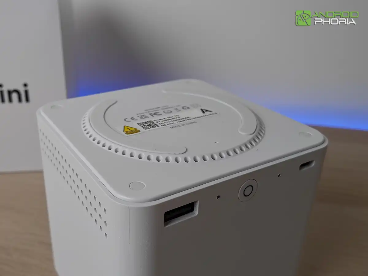 El Beelink ME mini es prácticamente un cubo perfecto. Mide 9,9 centímetros de ancho, largo y alto, ocupando poco menos de 1 litro de espacio si hablamos en términos de volumen. Puedes ponerlo en cualquier parte de tu casa y no molestará. Aparte, tiene un diseño muy moderno, con esquinas redondeadas, orificios de ventilación bien disimulados y puertos discretos.