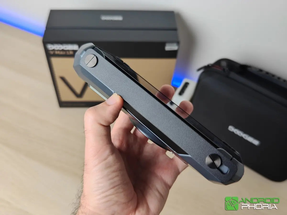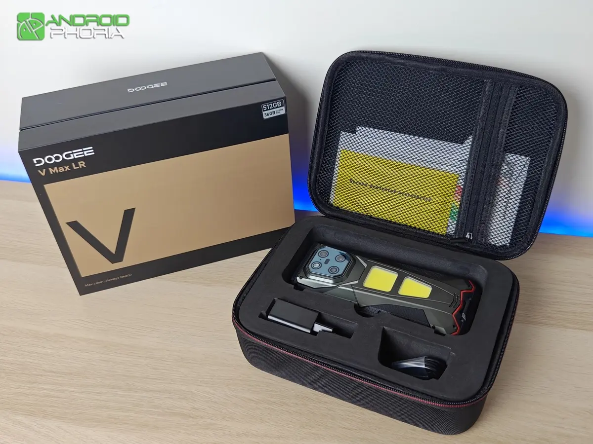 El unboxing del DOOGEE V MAX Play ya te da un indicio de que no estamos ante un móvil convencional. Viene muy bien protegido en una caja de cartón rígido y, dentro, encontré la primera gran sorpresa: el teléfono estaba guardado en una bolsa de almacenamiento muy práctica. Un nivel de resguardo adicional que, al sacarlo, entendí por qué era necesario.