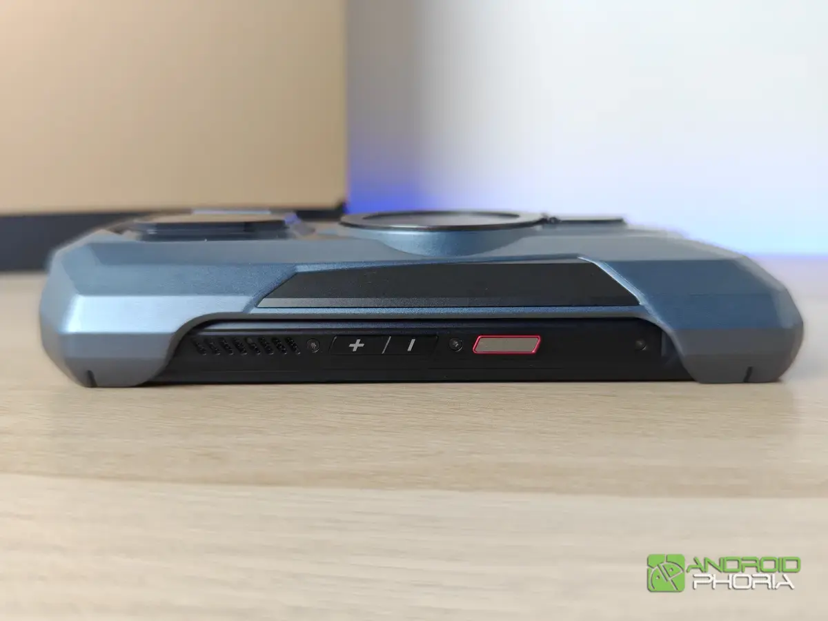 En sus bordes, encontramos sus botones de volumen, de encendido con sensor de huella integrado, un botón dedicado al proyector para activarlo rápidamente, y un botón personalizable para acciones rápidas. Un poco más oculto, está su puerto USB-C, protegido del polvo y agua por un tapón de goma.