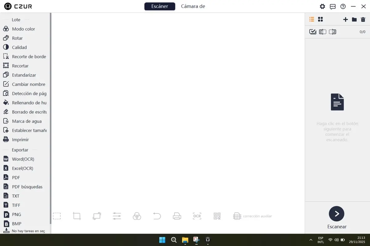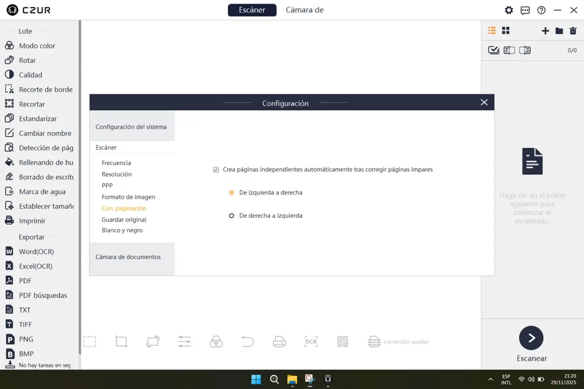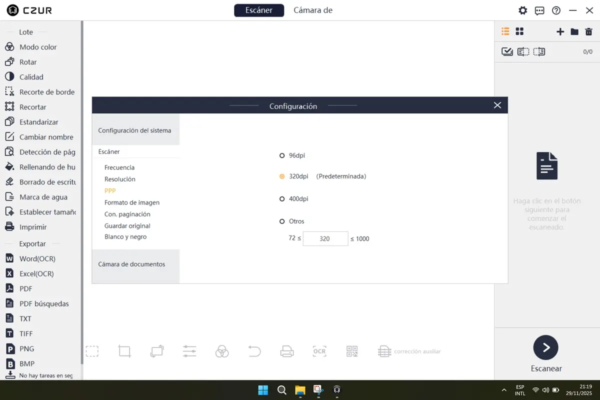 ¿Qué tal es su programa para PC? Excelente, te da la libertad total. Puedes elegir la resolución, el orden y el formato del archivo que se va a generar. Aquí es donde brilla el reconocimiento óptico de caracteres (OCR). Compatible con hasta 180 idiomas (incluido el español), te permite crear formatos editables como Word, Excel y PDF, transformando la imagen escaneada en un documento de texto que puedes buscar y editar.