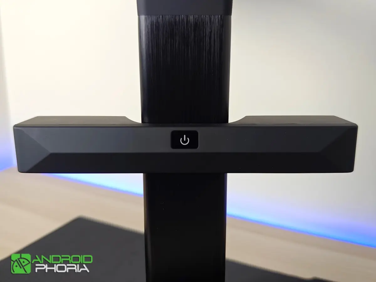 De la base se alza el mástil principal, que es el soporte de la tecnología cenital. A mitad de altura se acopla, de forma fácil y magnética, unas luces laterales desmontables que son un módulo de iluminación indirecta. Este tiene su propio botón de encendido independiente y sus focos están orientados en un ángulo de 45° para escanear documentos brillantes sin reflejos y sin que aparezcan sombras molestas.