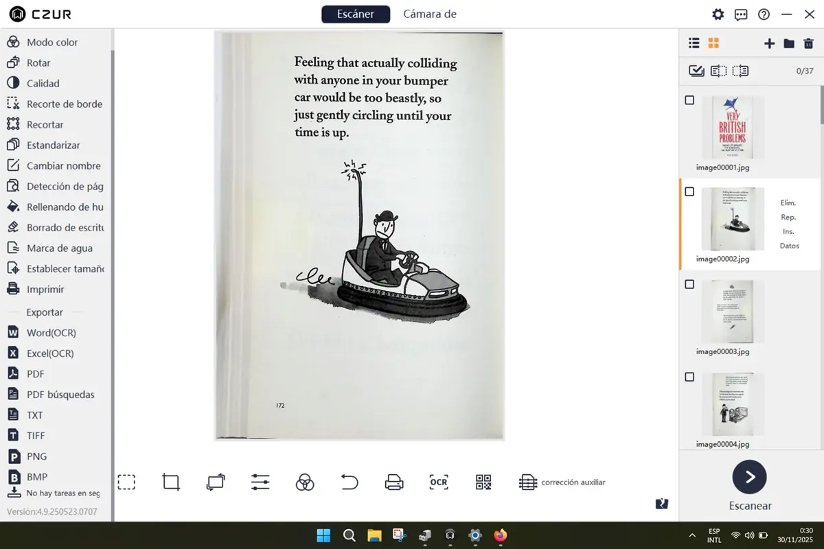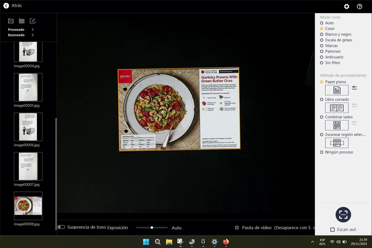 Comencé probándolo con la tapa de un libro y quedé totalmente satisfecho. El resultado es de una calidad impresionante, con una nitidez que captura cada detalle y una reproducción de colores fiel. Aparte, me di cuenta de que no tuve que esmerarme en colocar el libro con precisión, ya que el programa corrige automáticamente la inclinación y orientación para ofrecer un resultado centrado. Asimismo, recorta los bordes con precisión, eliminando la alfombrilla del fondo.