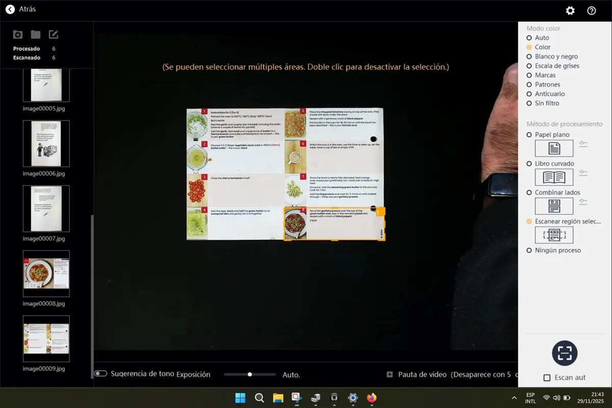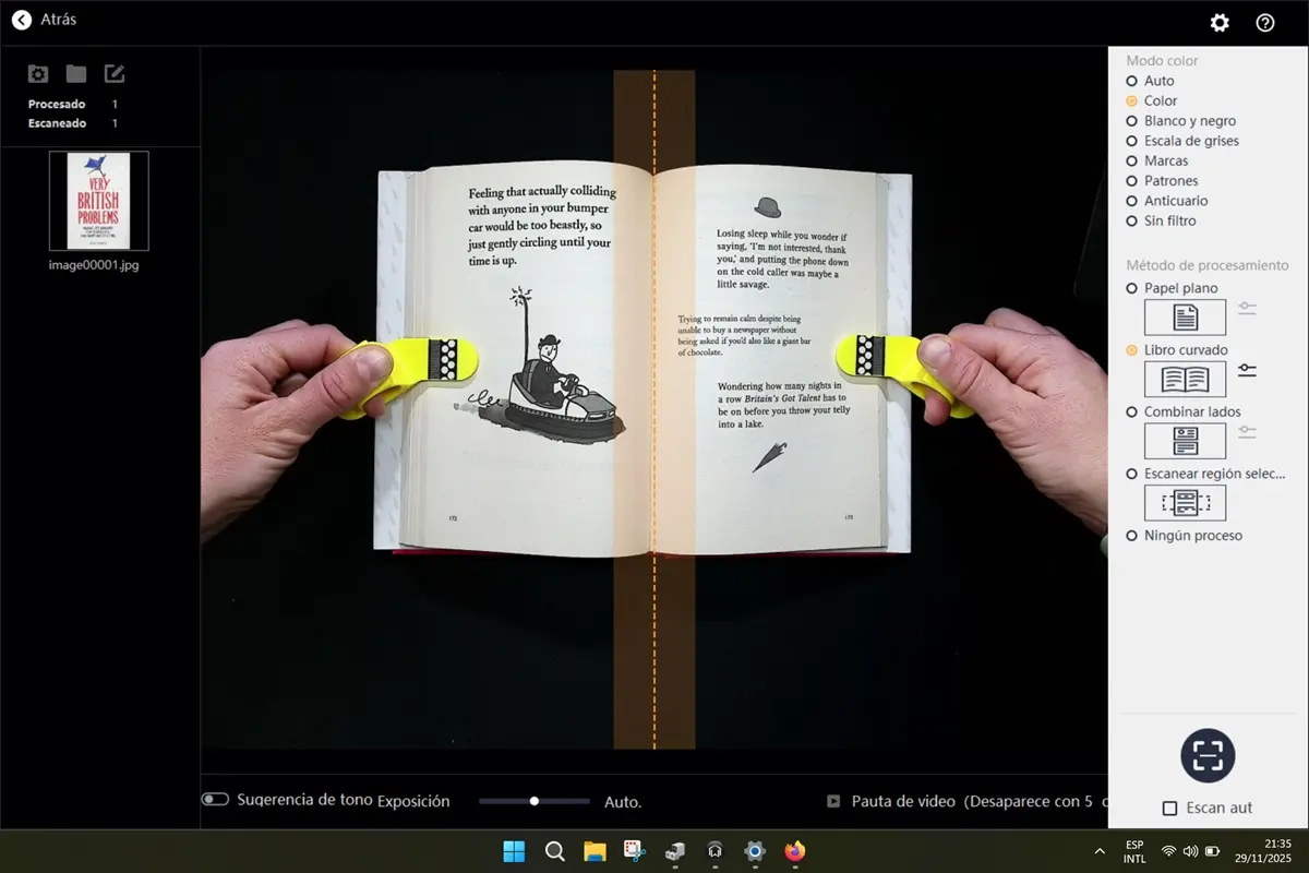 Para esto, puedes ayudarte de esos dedales amarillos que te mencioné antes, ya que el escáner los elimina eficazmente en el postprocesado. El proceso es alucinante: el escáner captura ambas páginas, las separa para digitalizar cada una por separado, las orienta, ordena, corrige la inclinación, recorta la alfombrilla del fondo y hasta aplana la curvatura del lomo con su tecnología láser. Que todo esto suceda en menos de 3 segundos por cada escaneo es increíble y facilita muchísimo las tareas de digitalización masiva.