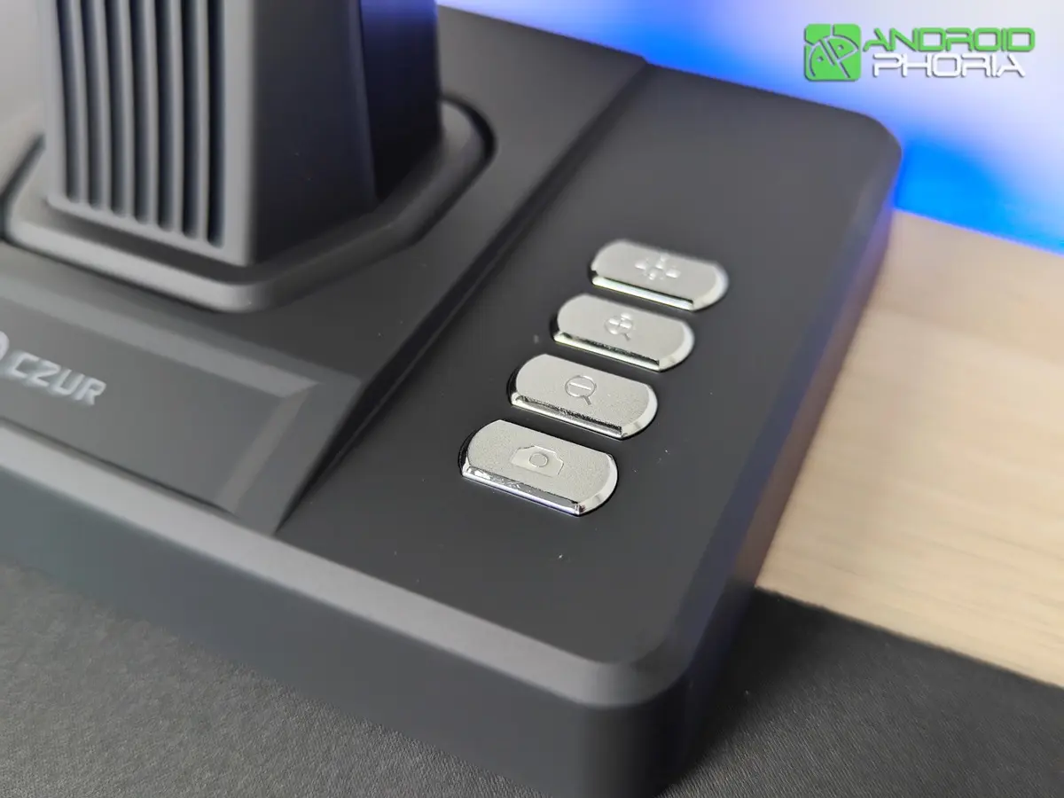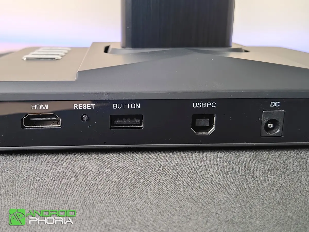 Está compuesto por una base sólida con patas antideslizantes que lo mantienen firme sobre la mesa. En esta base encontramos los puertos de conexión principales (HDMI para salida de vídeo, USB-B para conectarlo al PC, USB-A para conectar botones externos y el de alimentación DC) y unos botones dedicados para iniciar el escaneo, ajustar el brillo de la imagen y acercar o alejar el zoom.