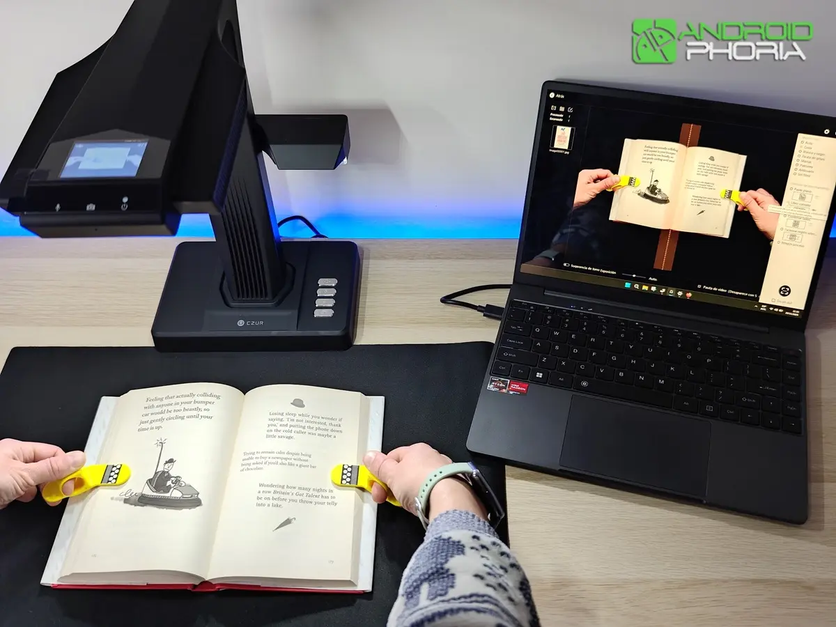 ¿La gran diferencia? Mientras el escáner plano tradicional te obliga a presionar el libro para aplanar el lomo y te arriesgas a dañarlo, el CZUR ET MAX trabaja desde arriba, capturando las dos páginas abiertas a la vez. Lo que más me impactó fue que esta cámara incluye tecnología láser para detectar la forma tridimensional del encuadernado para eliminar esa curvatura central de los libros.