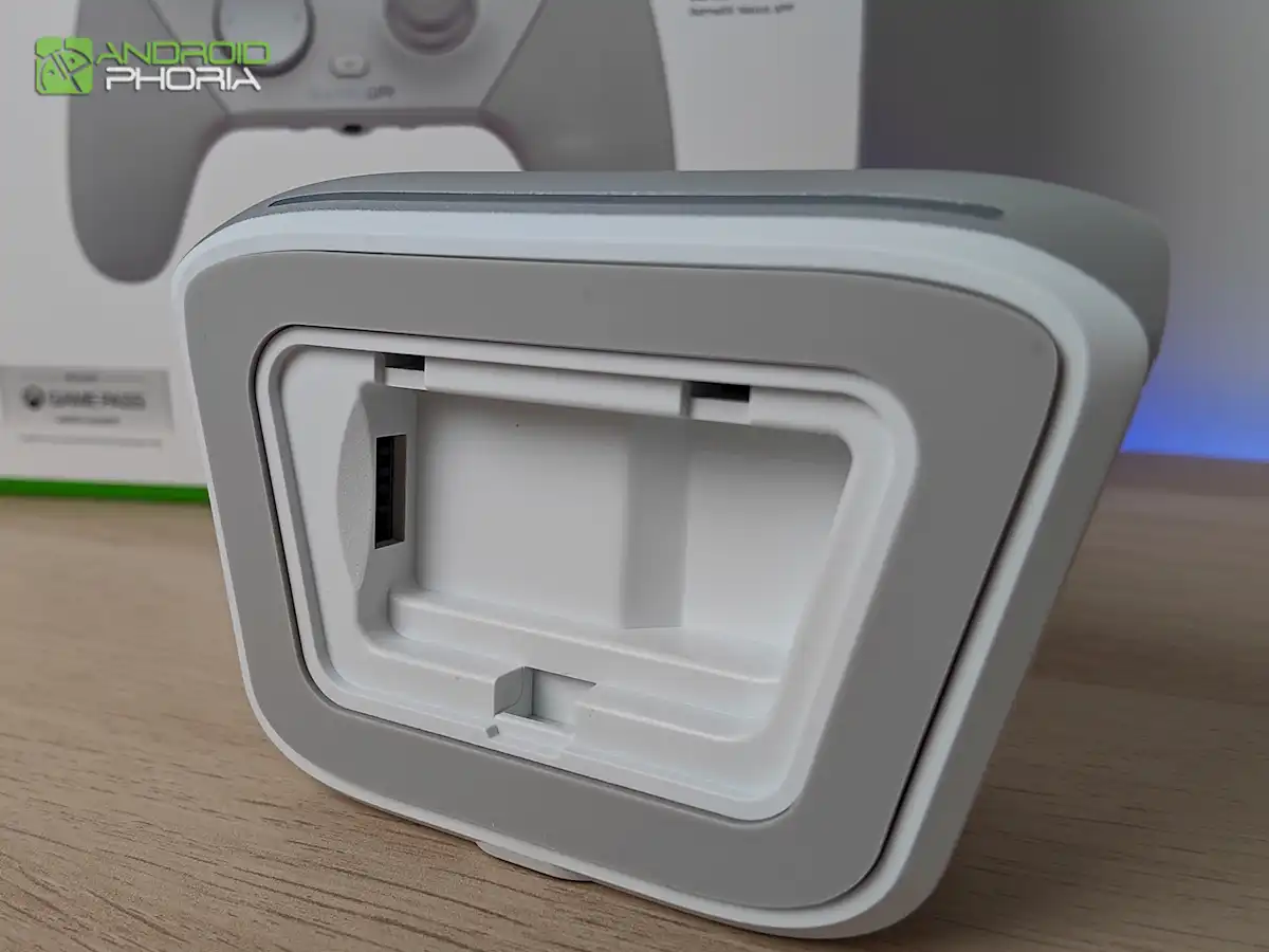 Pero su mejor sorpresa es la estación de carga incluida. No es la típica base: carga el mando automáticamente al dejarlo y tiene hasta un compartimento oculto para guardar el receptor inalámbrico (dongle de 2.4 GHz) y que no se pierda. Vamos, que lo deja todo listo para cuando quieras usarlo.