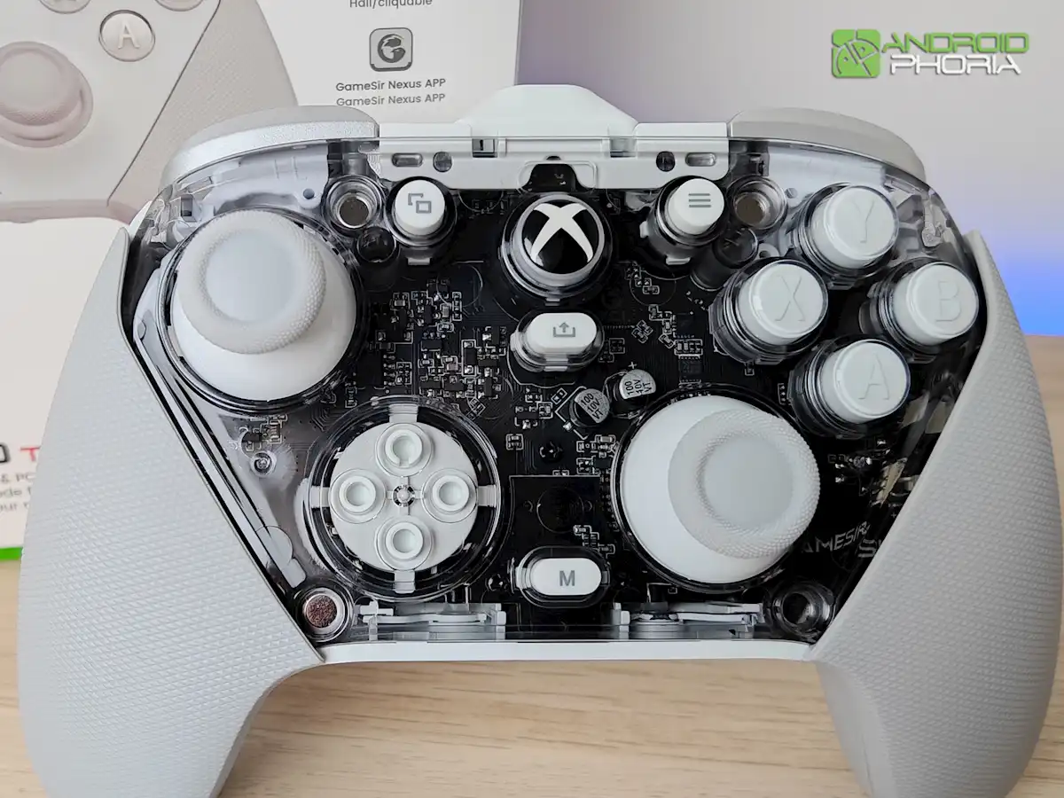 Cabe destacar que la carcasa frontal es intercambiable, al igual que en los modelos GameSir G7 y G7 SE, pero en este caso, el diseño es de tres partes: la placa frontal y las dos empuñaduras, que funcionan como carcasas independientes. Esto permite compatibilidad con las carcasas de los modelos anteriores (pero las carcasas del G7 Pro no son compatibles con otros mandos de la serie). Por cierto, detrás de la carcasa intercambiable, ahora tiene una cubierta frontal transparente que permite ver los circuitos internos del mando y da ese toque «pro» que siempre mola.