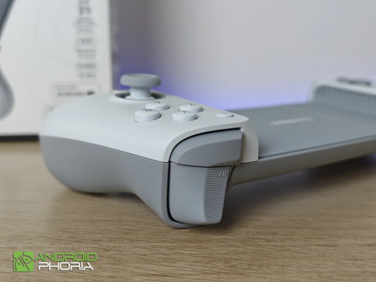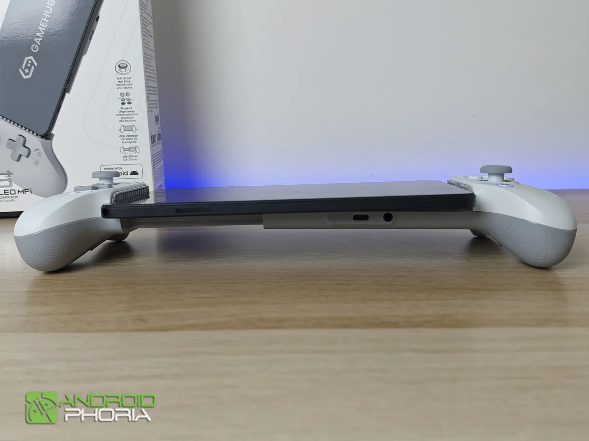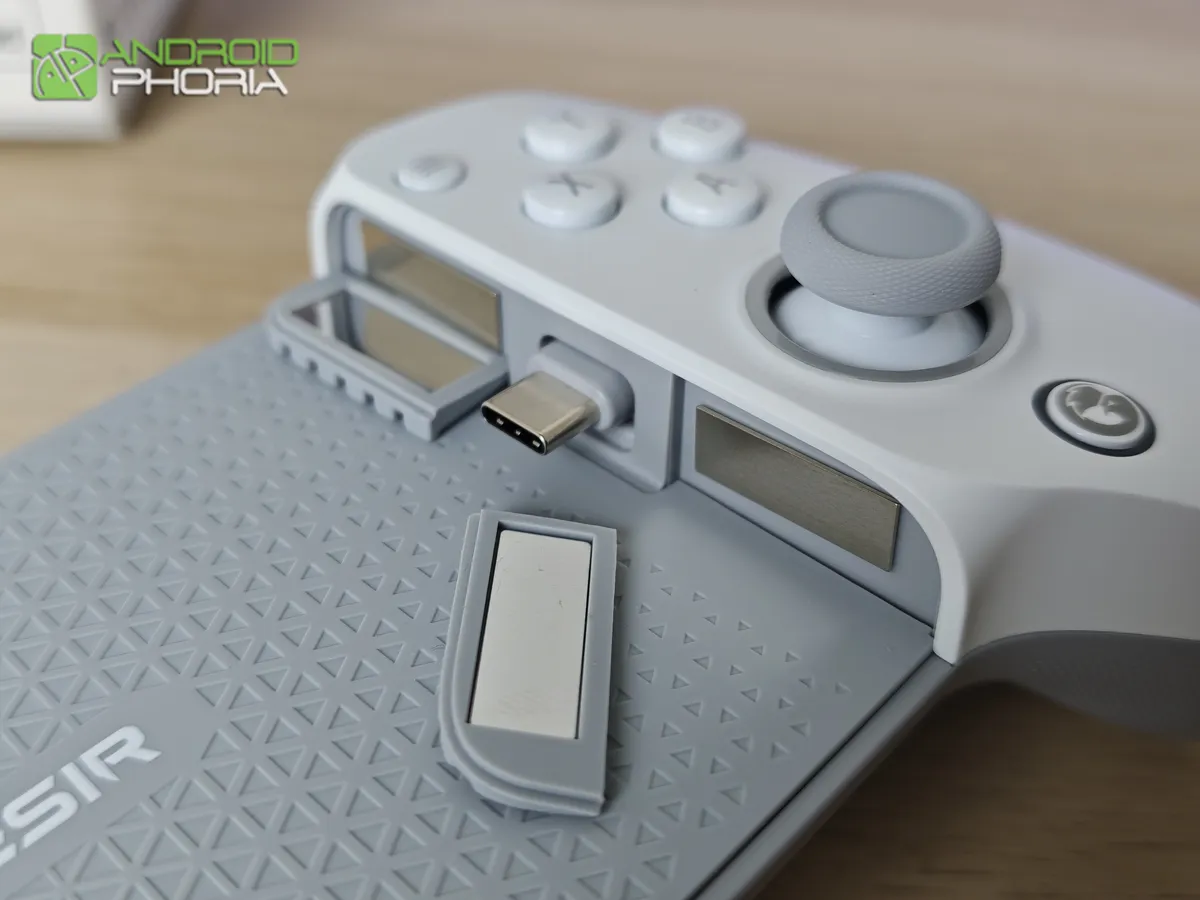 Incluye también una generosa almohadilla de silicona en toda la zona de acoplamiento del dispositivo, incluso en los laterales, para evitar roces o rayaduras. Su conector USB-C se siente firme y de calidad, dicho sea de paso. En cuanto a puertos, tiene dos: un USB-C con carga passthrough (permite usar el mando mientras el móvil se carga) y un jack de 3.5 mm para auriculares.