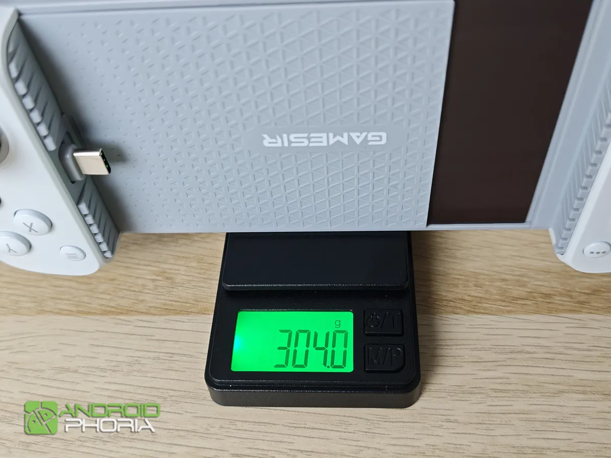 Volviendo a la ergonomía, las empuñaduras cuentan con un texturizado de silicona que mejora el agarre y evita que el sudor sea un problema. Al ser un mando exclusivamente por USB-C (sin Bluetooth), no lleva batería, lo que lo hace bastante ligero: pesa unos 300 gramos, un peso más que aceptable considerando que monta dos motores de vibración. En mi experiencia, nunca se me cansaron las manos jugando con él.