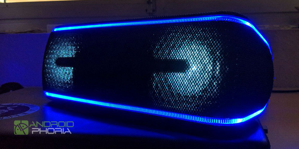Viene con una banda de colores que lo recubre y Ledes en los altavoces en sí que se pueden configurar. Sus dimensiones son de 10,5 x 29,1 x 10,4 cm y pesa 1,5 Kg. Sí, pesa, pero está en límite de ser considerado portable y se puede llevar con una mano. Es resistente al agua IP67, es decir, se puede sumergir y seguirá funcionando.