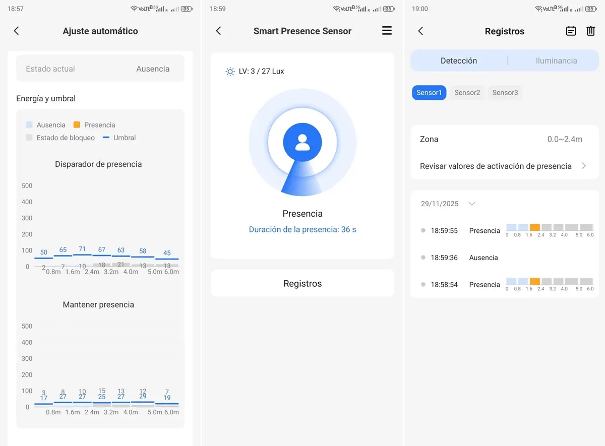 También puedes ajustar la sensibilidad en 7 niveles para bloquear áreas específicas donde no quieres detección. Además, puede definir los tiempos de presencia y ausencia, es decir, cuánto tiempo debe pasar sin detectar a nadie para dar la zona por vacía, evitando que las luces se apaguen si me quedo quieto.