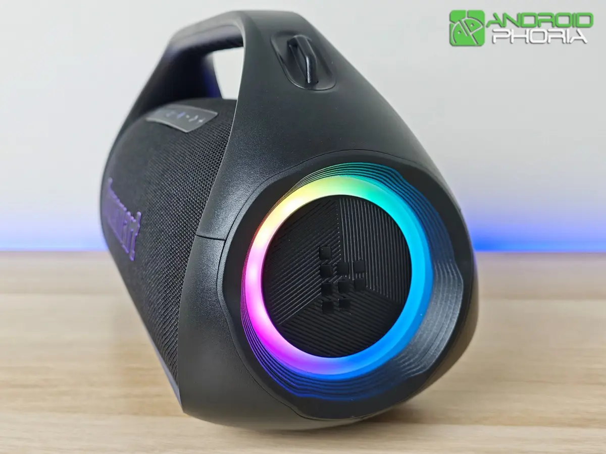 Lo primero que destaca es su asa de agarre integrada (similar a la que vimos en el Tronsmart Bang SE que ya probamos). Es ergonómica, firme y facilita muchísimo el transporte, haciendo que moverlo de un lado a otro sea sorprendentemente cómodo a pesar de sus kilos.