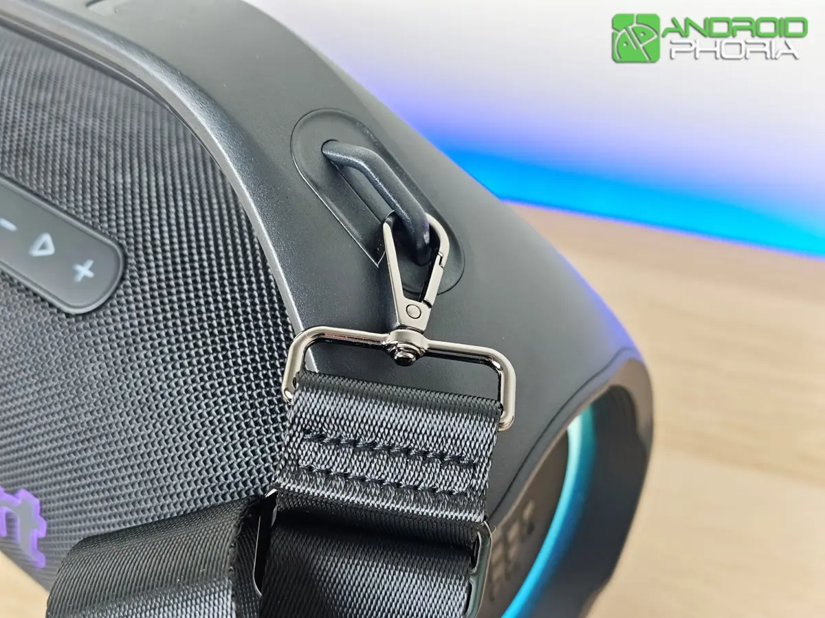 Además, un detalle que me ganó por completo es que en los extremos del asa incluye puntos de anclaje para una correa de transporte. En un mercado actual tan austero, donde las marcas te venden hasta el cable de carga por separado, se agradece que Tronsmart incluye la correa en la caja. Y es muy fácil de poner, en sus extremos tiene estos ganchos de toda la vida que hacen muy sencilla su instalación.