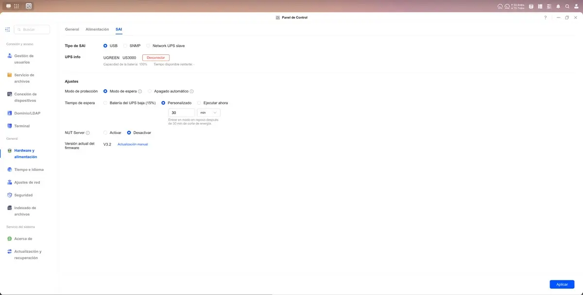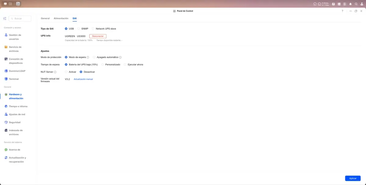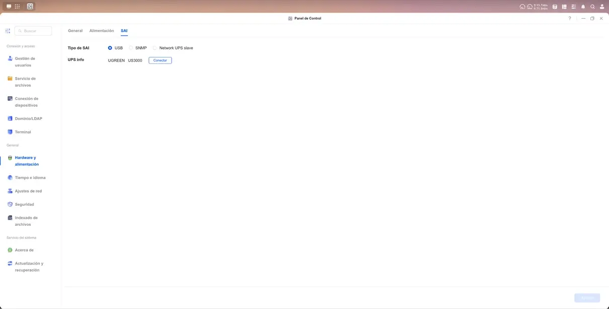 Quise poner a prueba estas promesas y la experiencia fue sumamente sencilla. Gracias a la conexión USB, el UPS se comunica directamente con UGOS Pro, el sistema operativo de los NAS de UGREEN. Solo tuve que entrar al panel de control desde mi PC (aunque también se puede hacer desde la app móvil), ir a la sección de «Hardware y alimentación» y allí apareció el UGREEN US3000 reconocido automáticamente como un SAI.