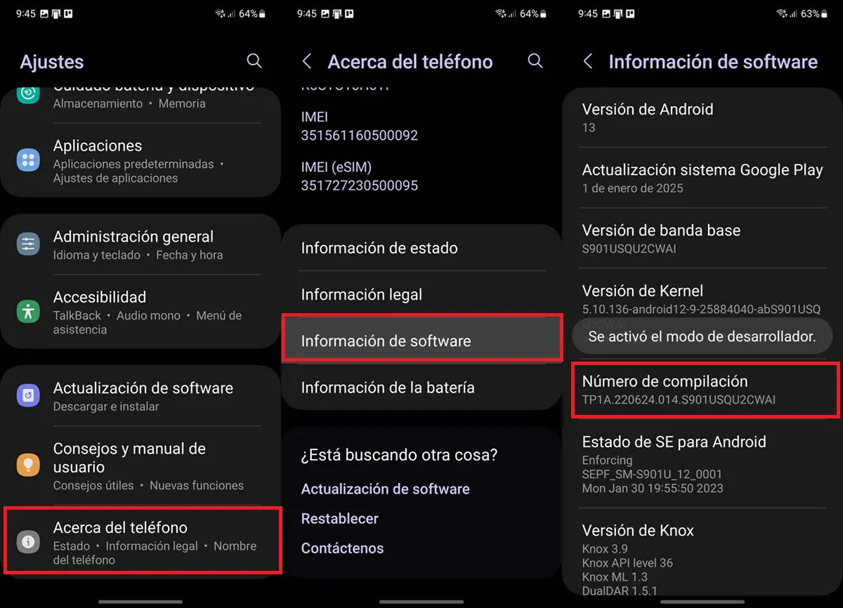 - Ve a «Información de software» y pulsa repetidas veces en Número de compilación hasta que diga que eres desarrollador o que se activaron las opciones de desarrollador.
