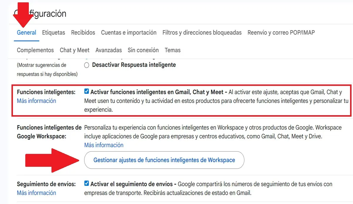 - En la sección llamada Características inteligentes, desmarca la casilla Activar funciones inteligentes en Gmail, Chat y Meet.