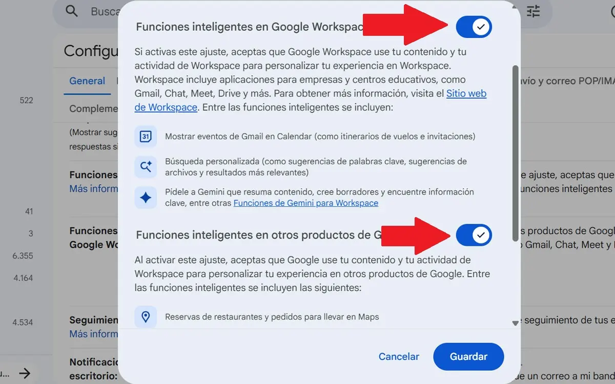 - Desactiva las casillas Funciones inteligentes en Google Workspace y Funciones inteligentes en otros productos de Google.
