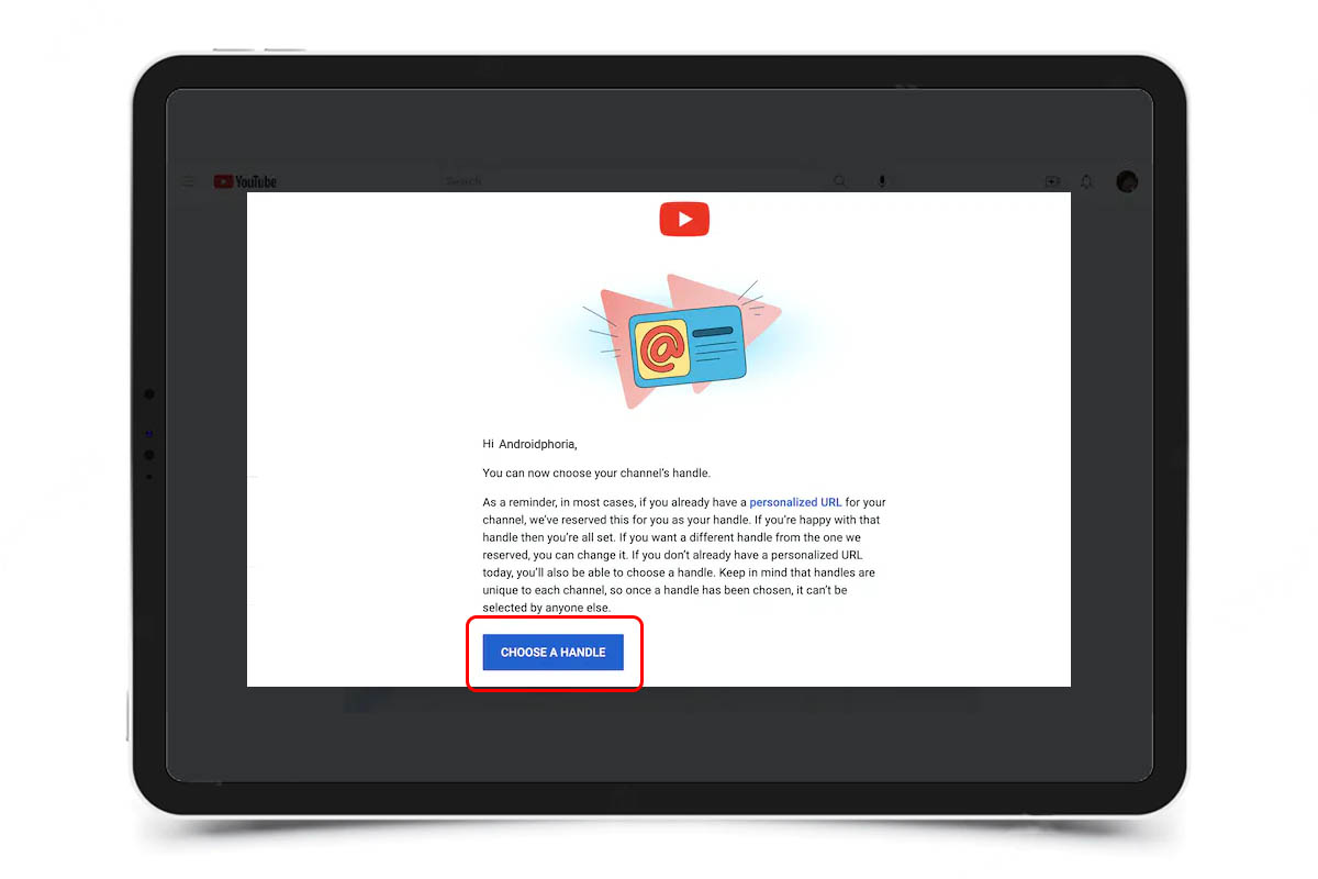 Hay diferentes formas de acceder al panel de selección de nombre de usuarios en YouTube: la primera, es que Google te envíe un correo invitándote a elegir tu identificador, en ese caso, pulsa el botón azul «Elegir un identificador»; el segundo, a través de una notificación en YouTube Studio que deberás pulsar; la tercera, a través de la URL que te lleva directo al panel de selección.