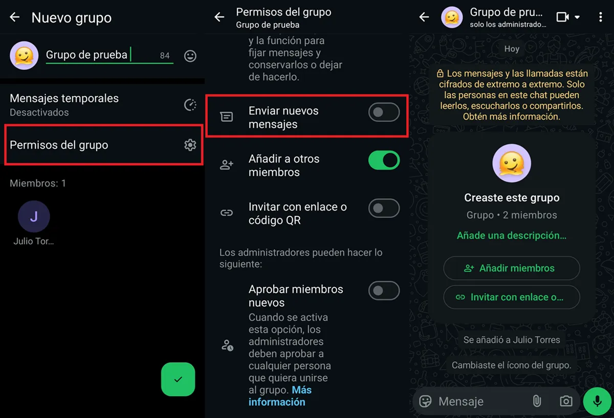 Dado que la función deseada no existe dentro de la herramienta «Canales», la solución más cercana y efectiva es utilizar un grupo de WhatsApp tradicional con una configuración muy específica. Puedes crear un grupo normal e inmediatamente configurar los permisos para que solo los administradores puedan enviar mensajes de esta forma: