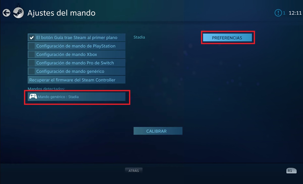 - Si el mando está bien conectado, Steam debe mostrarlo en esta sección como «Mando genérico» o «Mando genérico: Stadia».