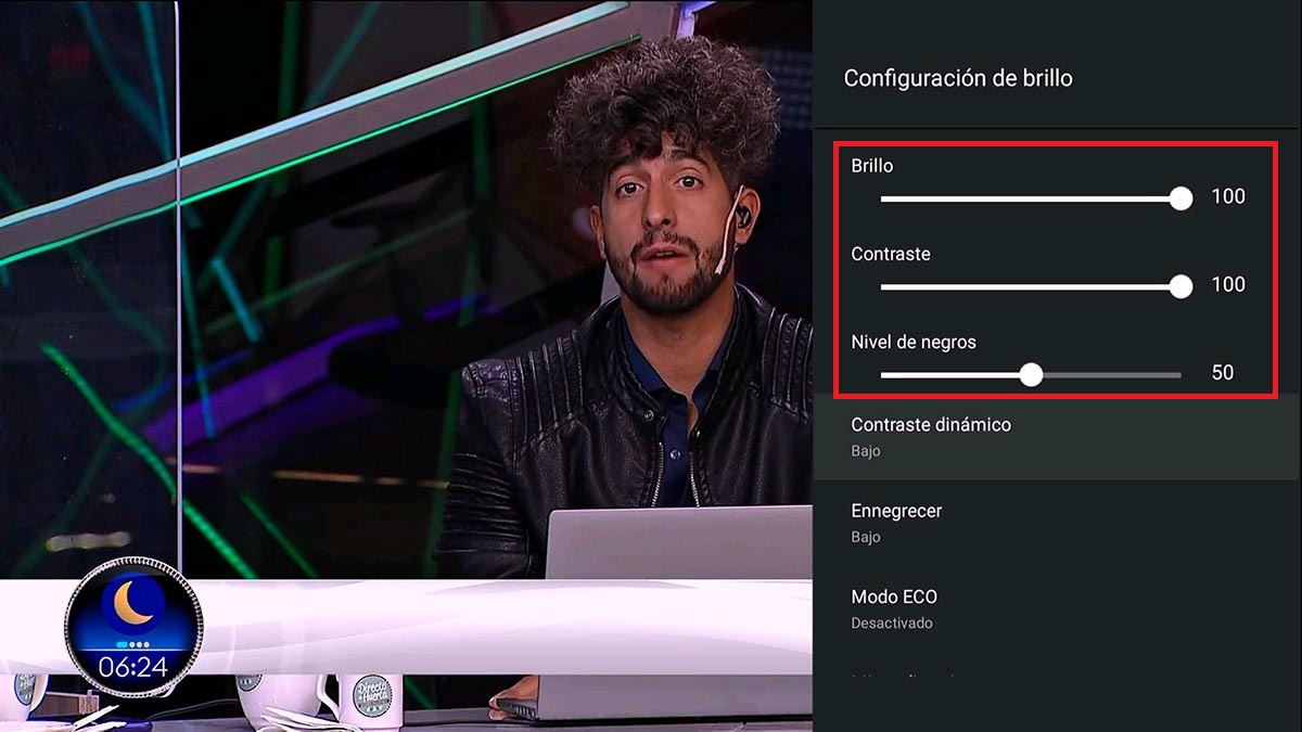 - Pon el Brillo y el Contraste al 100%. Por otra parte, en el apartado de Nivel de negros, deberás colocar la barra justo en el medio, en el 50%.
