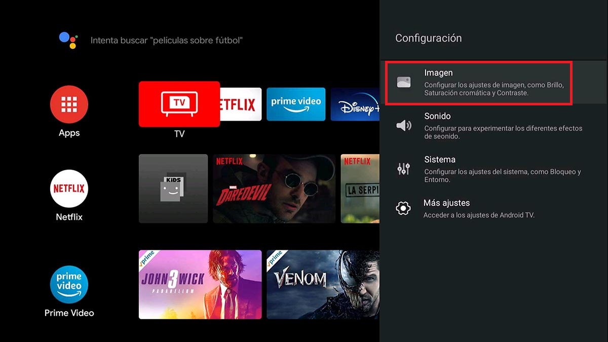 - En el menú que se desplegará en la pantalla de tu Android TV TCL, deberás pinchar sobre la opción que dice Imagen (la primera de todas).